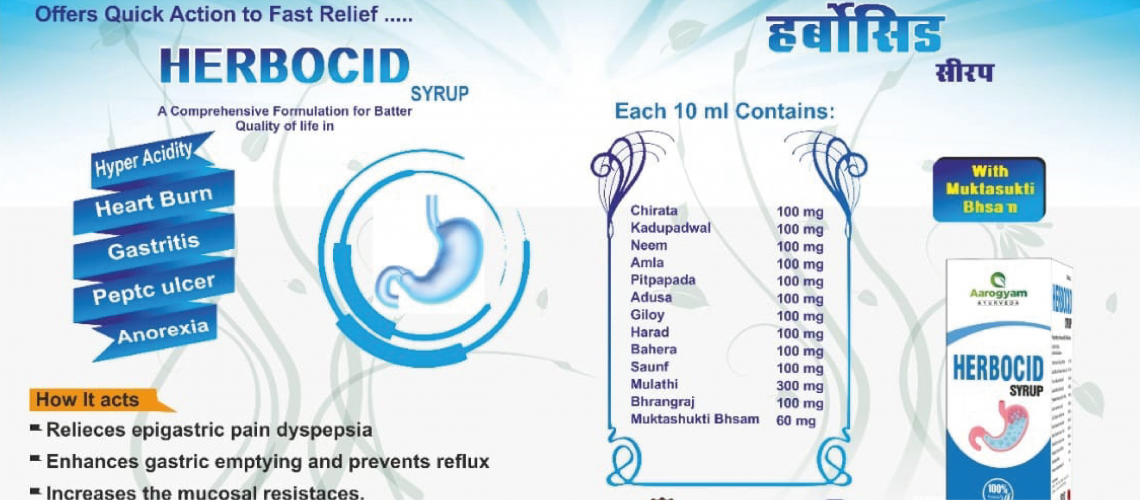 “HERBOCID SYRUP” is a dynamic formulation that improves appetite, promotes digestive power, increases the mucosal resistances, enhances gastric emptying and prevents gastroesophageal reflux, relieves epigastric pain, cures abdominal discomfort and bloating. It’s safe and effective as it is made from 100% natural herbs.